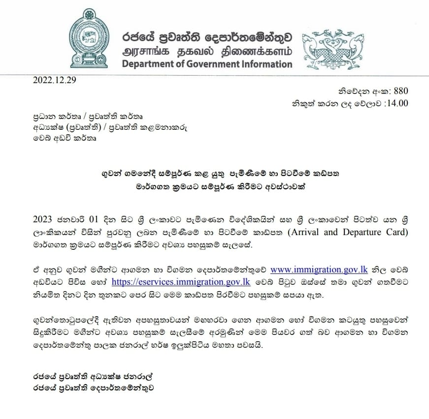 « Des aménagements en ligne ont été introduits pour remplir les cartes d’arrivée par les étrangers venant au Sri Lanka à compter du 1er janvier 2023. En conséquence, les passagers aériens sont invités à remplir cette carte en ligne trois jours avant leur voyage, en visitant le site Web officiel du Département de l’Immigration et de l’Emigration. Cette démarche permet ainsi aux passagers d’accomplir les formalités d’immigration et d’émigration sans aucun inconvénient » explique le Département de l’Information Gouvernementale dans un communiqué.