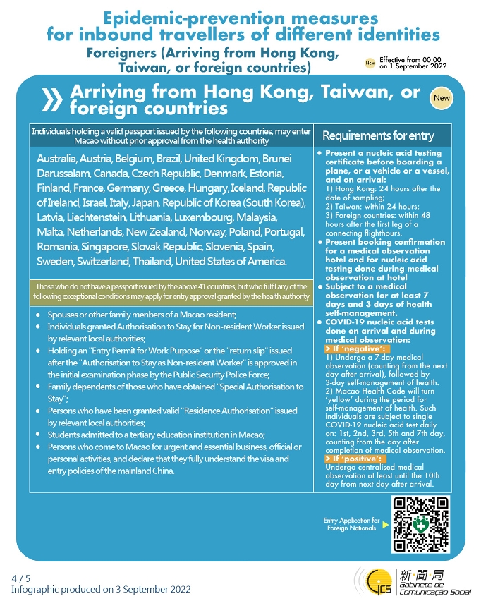 Sur son site internet, le gouvernement de Macao explique que les titulaires de passeports valides des 41 États mentionnés ci-après peuvent entrer à Macao depuis des pays et régions autres que Hong Kong, Taïwan et la Chine continentale, et ce, sans autorisation préalable des autorités sanitaires, à compter du 1er septembre 2022: