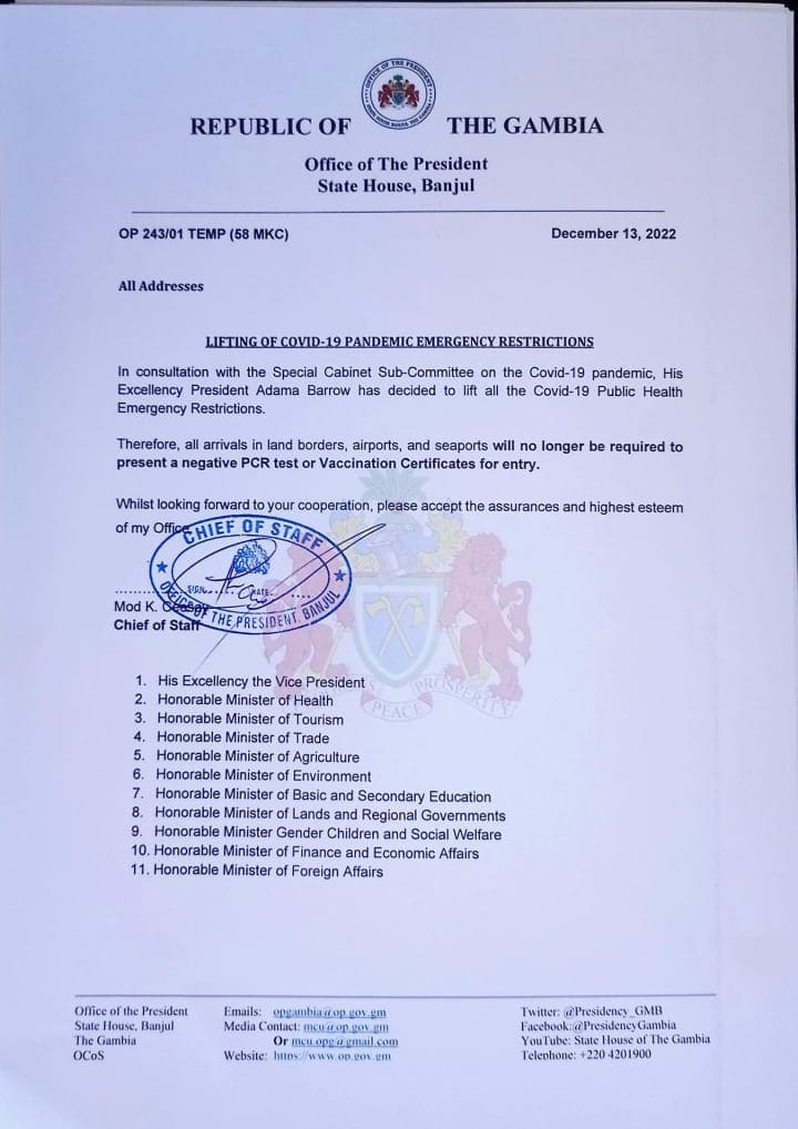 Les autorités gambiennes ont publié hier un communiqué indiquant que le Président Adama Barrow a décidé de lever toutes les restrictions d’urgence de santé publique liées Covid-19, y compris à ses frontières en supprimant les exigences de test PCR et de certificat de vaccination.