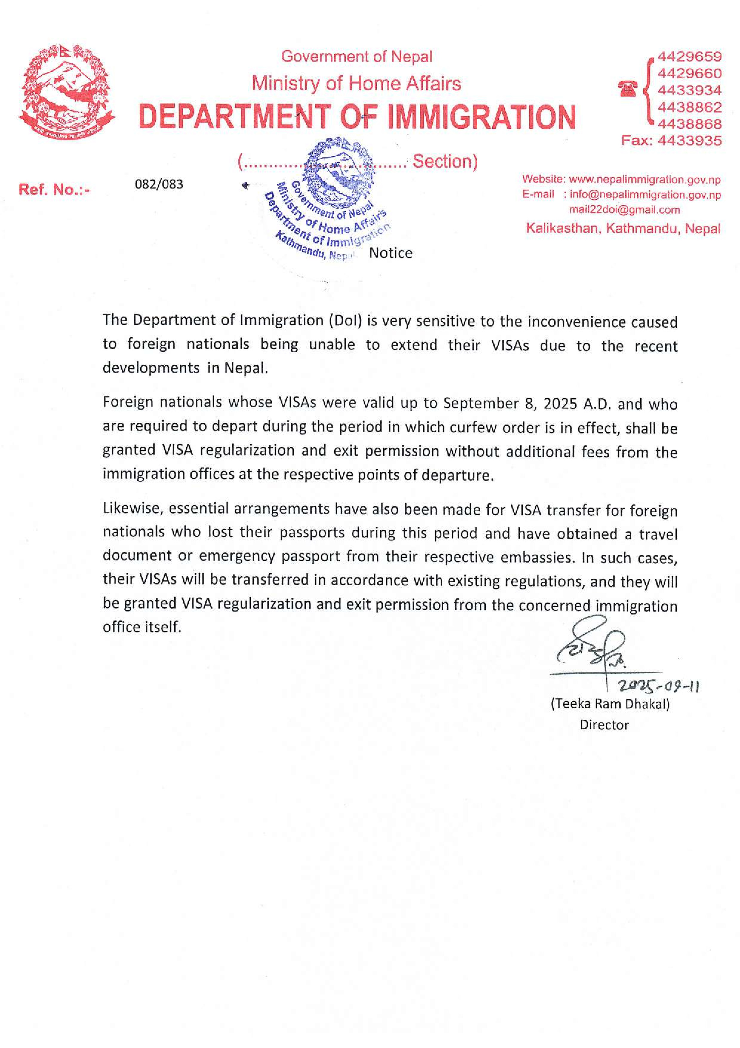 On September 11, 2025, Nepal’s Department of Immigration (DoI) issued an official notice for foreign nationals affected by the crisis.